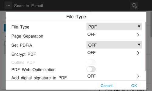 When setting a file format, select [File Type] on the Scan screen, and select the desired file format. The following file formats are supported on this machine.