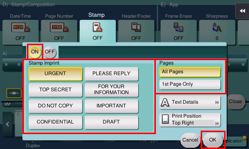 If the date/time, page number, and stamp are difficult to see with the default settings, tap [Text Details] on each of the [Date/Time], [Page Number], and [Stamp] setting screens; you can set the text size and font type. If the date and time, page numbers or stamp are over the text of the original, tap [Print Position] in each of the [Date/Time], [Page Number] and [Stamp] setting screens to set the printing positions.