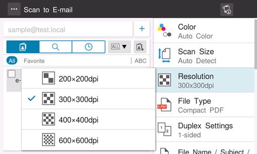 When setting the resolution, select [Resolution] on the Scan screen, and select the desired resolution. The greater the value, the finer granularity is achieved for the image.
