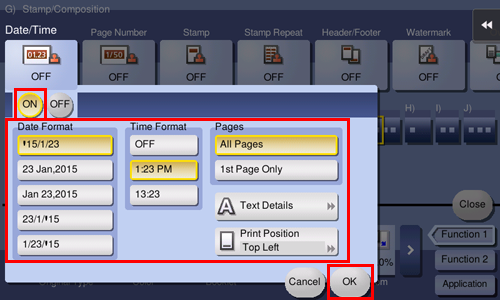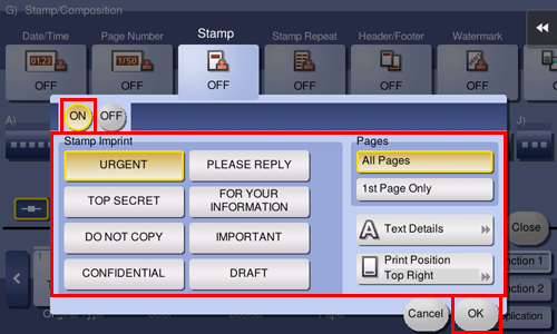 If the date/time, page number, and stamp are difficult to see with the default settings, tap [Text Details] on each of the [Date/Time], [Page Number], and [Stamp] setting screens; you can set the text size and font type. If the date and time, page numbers or stamp are over the text of the original, tap [Print Position] in each of the [Date/Time], [Page Number] and [Stamp] setting screens to set the printing positions.