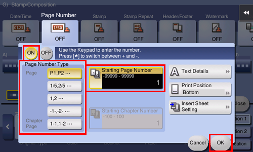 To add page numbers, tap [Page Number] in [Application] of copy mode of classic style, and set [Page Number Type] and [Starting Page Number]. If you have selected [Chapter Page] for [Page Number Type], specify the chapter number to start printing in [Starting Chapter Number]. When copying with covers, you can set the page numbers to be printed on the covers using [Insert Sheet Setting].