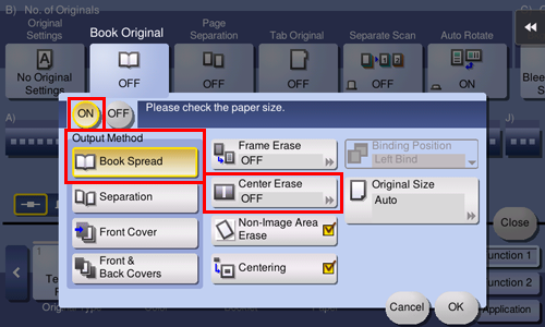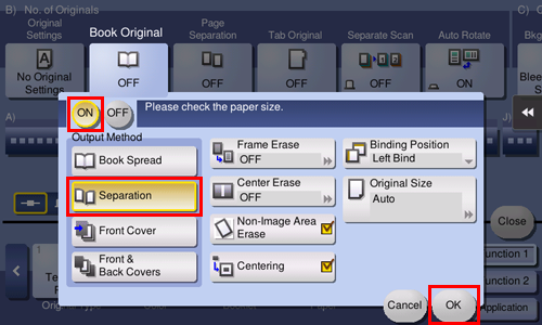Tap [Book Original] in [Application] of copy mode of classic style, and select [Separation]. When paper is set to [Auto], a message appears to notify that the paper tray will be switched. Tap [Yes].