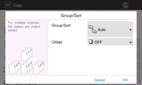 Tap [Group/Sort] on the Copy screen. Select [Group/Sort] - [Sort], and also select [Offset] - [ON].