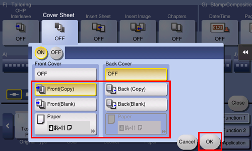 Tap [Cover Sheet] in [Application] of copy mode of classic style, and set the front and back covers.