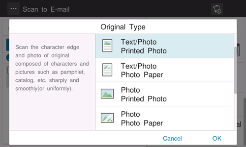 [Photo Photo Paper] | Scans an original consisting of only photos at the optimum image quality level. Select this option to scan originals printed on photographic paper. |