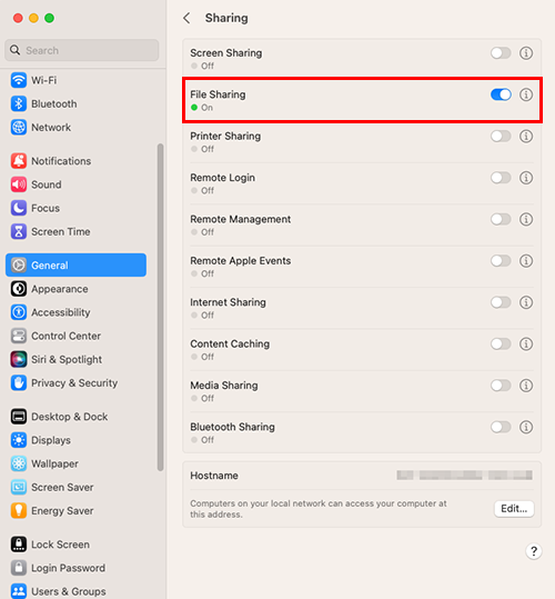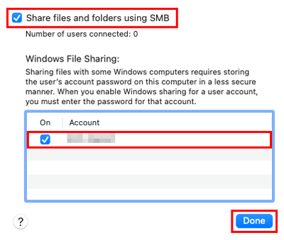 In macOS 11/12, click [Options], and select the [Share files and folders using SMB] check box. Then, select the check box of the login user name (displayed name), and click [Done].