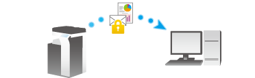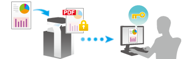 You can restrict file viewing with a password or assign operation privileges to a file when distributing original data as a PDF file. Also, you can add a digital signature using the certificate of the MFP. Encrypting a file prevents unauthorized viewing by third parties. Furthermore, adding a digital signature provides assurance regarding the authenticity of a file author (MFP) and ensures that the file has not been falsified.