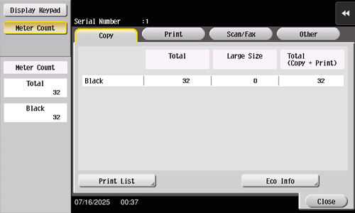 The counter allows you to calculate the total number of printed pages on a function basis, and check the results. You can check the machine counter and review the operation method of this machine based oneco information to develop an awareness of costs and work to reduce costs.