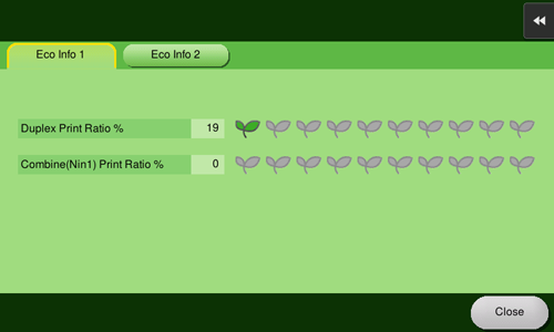 The Eco Info function automatically calculates the ratio of paper saving by two-sided printing or page combine function and a transition of power consumption based on the usage of this machine, all of which enables you to check the resulting eco information. You can review the operation method of this machine based on eco information to develop an awareness of costs and work to reduce costs.
