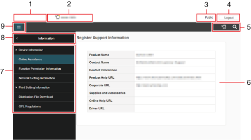 3 | Login user name | Displays the login mode and user name. Click the user name when you log on as a registered user to confirm the user information. |