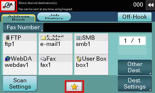 [Escáner/Fax] | Visualiza la pantalla principal en modo de escanear/enviar por fax. |
