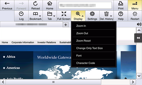 [Código de carácter] | Cambie el código de carácter. La pantalla de selección de código de carácter se agrupa para cada región que se va a mostrar. Si se detectan caracteres ilegibles, especifique cualquier código de carácter y cambie la visualización de la página web para corregir el error. |