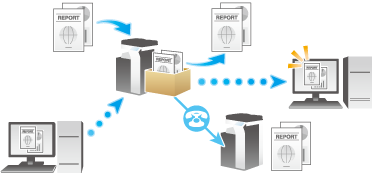 Los datos del original escaneados por la máquina pueden convertirse en un archivo y almacenarse en la carpeta de usuario. Asimismo, los datos pueden almacenarse en la carpeta de usuario cuando se ha especificado que la impresión se realice en cualquier PC en funcionamiento en la red. Un archivo almacenado en la carpeta de usuario puede imprimirse o enviarse a otro usuario.