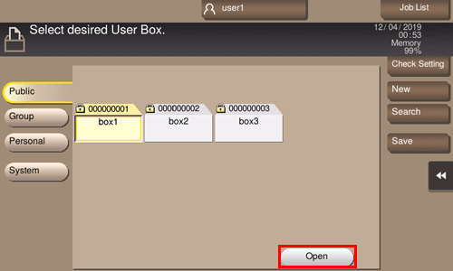 En este ejemplo, se utiliza la carpeta de usuario pública para fines explicativos. Para utilizar una carpeta de usuario personal o una carpeta de usuario de grupo, toque [Privada] o [Grupo] y seleccione la carpeta de usuario deseada.