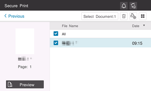 ) de la parte superior derecha para configurar las opciones de impresión.Si la opción de impresión simple para el documento de impresión segura está activada, seleccione el ID de documento de destino de la lista de ID de documento. Para obtener más información sobre la impresión simple, consulte Activación de la impresión simple para el documento de impresión segura (para el administrador).