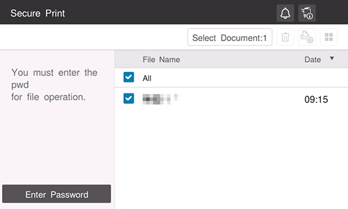 ) de la parte superior derecha para configurar las opciones de impresión.Si [Prohibir funciones] está ajustado a [Modo2] en [Utilidad] - [Administrador] - [Seguridad] - [Información de seguridad] - [Prohibir funciones], también deberá introducir la contraseña cuando seleccione un archivo de la carpeta de usuario para impresión segura. Es preciso introducir la contraseña de cada archivo incluso aunque los documentos seguros tengan el mismo ID de documento. Por lo tanto, el nivel de seguridad es superior al del [Modo1] predeterminado.