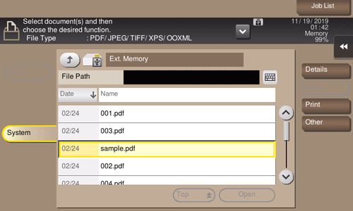Seleccione [Utilidad] - [Administrador] - [Configuración de sistema] - [Configuración de carpeta de usuario] - [Ajustes de la función de memoria USB] y ajuste [Imprimir documento] a ON para permitir la impresión de archivos desde una memoria USB. Puesto que la impresión de archivos está activada de forma predeterminada, el usuario puede utilizar la memoria USB en la máquina sin preparación previa.