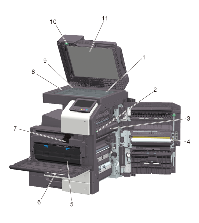 1 | Alimentador de documentos dúplex | Introduce de forma automática y escanea los originales por páginas. Esta unidad también invierte los originales y los escanea automáticamente a 2 caras. Esta unidad se denomina ADF en el manual. |
