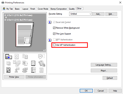 Asegúrese de que [Autenticación IdP] está configurado como [Activado] o [Activado(Dar prioridad a la autenticación IdP)] en [Opciones dispositivo] en la pestaña [Configurar] del controlador de impresora (predeterminado: [Desactivado]). Para obtener más información sobre el [Opciones dispositivo], consulte Configuración del entorno opcional de esta máquina.