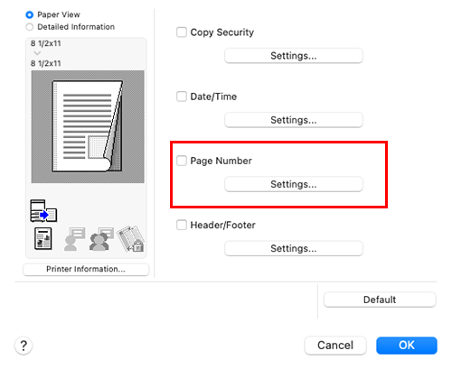 En [Sello / Composición], seleccione la casilla de verificación [Número de página].