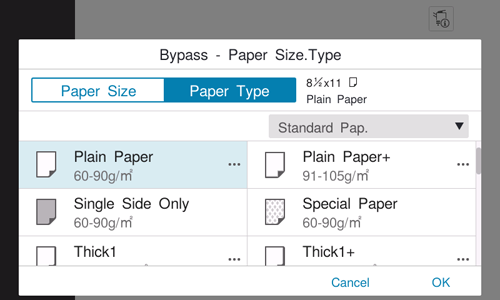 ) en [Papel normal] de [Tipo de papel] y seleccione [Cambiar grosor ON]. La bandeja de papel para la que se ajusta [Cambiar grosor ON] se coloca en un nivel de prioridad bajo entre las bandejas de papel en las que se carga papel normal. Sin embargo, si se ajusta [Cambiar grosor ON] para todas las bandejas de papel, se seleccionará la bandeja de papel adecuada en función de la secuencia de prioridad especificada en [Utilidad] - [Utilidad] - [Configuración de sistema] - [Configuración selección bandeja papel auto.].Para cargar papel de tamaño personalizado, introduzca directamente la longitud y la anchura del papel.