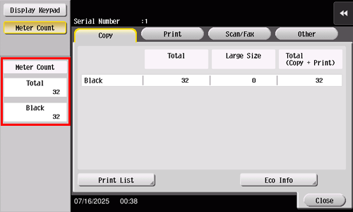 Permite comprobar el número total de páginas copiadas. (Este valor incluye el número de páginas en las que se imprimen los datos guardados en una carpeta de usuario en modo de copia y el número de páginas de impresión de lista en Configuración administrador.)