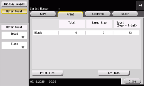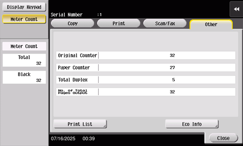 Compruebe el número total de páginas originales escaneadas e impresas, el número total de hojas impresas, el número total de páginas impresas por las dos caras y el número total de páginas impresas con independencia de la función.