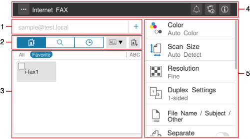 4 | Icono del menú ( | Puede registrar la configuración actual como favorita y recuperarla, o cambiar la forma de mostrar la lista de destinos registrados en el área de especificación de destinos. También puede ordenar los elementos de configuración de opciones para el envío o cambiar la configuración de opciones predeterminada para el envío por la configuración que desee. Para obtener más información, consulte Pantalla de configuración en cada modo. |