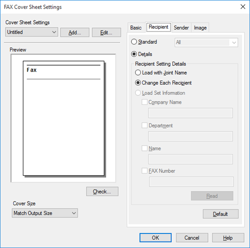 [Cambiar cada destinatario] | Esta opción cambia la información escrita en la portada para cada destinatario. Introduzca el contenido de [Destinatario] que aparece en la pantalla [Ventana emergente transmisión fax]. Puede crear diferentes portadas para hasta 100 destinatarios. | |