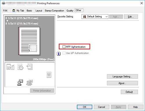 Si el ordenador es capaz de comunicarse con esta máquina, haciendo clic en [Verificar] se ejecutará la autenticación de acuerdo con la información de autenticación que se haya introducido. Puede comprobar que la información de autenticación no contenga errores antes de empezar a imprimir.