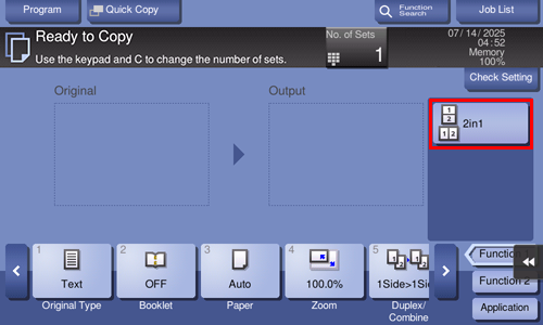 Para establecer una tecla de acceso directo del modo de copia, seleccione [Utilidad] - [Utilidad] - [Personalizar] - [Configuración de copia] y ajuste [Configuración rápida 1] o [Configuración rápida 2] a ON. A continuación, seleccione la configuración que desea visualizar como tecla de acceso directo.