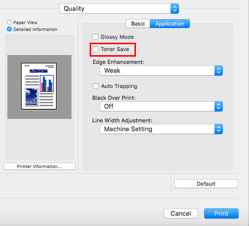 Wenn Sie das Kontrollkästchen [Toner Save] unter [Quality] aktivieren, wird die Druckdichte angepasst, um den Tonerverbrauch zu reduzieren.