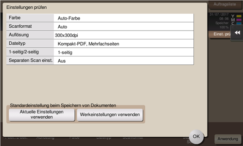 Tippen Sie unter [Standardeinstellung beim Speichern von Dokumenten] auf [Aktuelle Einstell. verwenden].