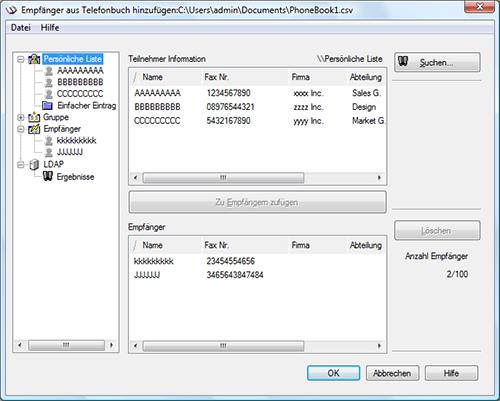 Um einen Empfänger aus dem Telefonbuch zu löschen, wählen Sie den Empfänger aus [Persönliche Liste] aus und klicken Sie dann auf [Löschen]. Der Empfänger wird aus der registrierten Gruppe gelöscht.