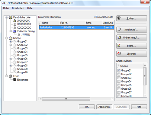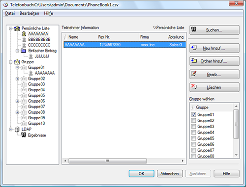 Die Teilnehmerinformationen werden registriert und unter [\\Telefonbuch\Persönliche Liste] angezeigt. Wenn Sie Gruppen für den Empfänger ausgewählt haben, wird dies in der Gruppenliste angezeigt.
