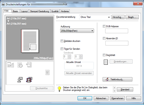 Wenn Sie Empfänger, an die Sie häufig Faxe senden, im Telefonbuch registriert haben, können Sie beim Senden eines Fax schnell den Empfänger auswählen. Fügen Sie Empfänger auf der Registerkarte [FAX] des Faxtreibers zu einem Telefonbuch hinzu.
