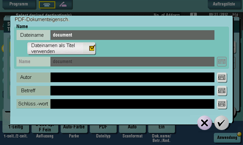 [Name] | Setzen Sie [Dateinamen als Titel verwenden] auf AUS, um einen Titel einer PDF-Datei (max. 64 Zeichen) einzugeben. |