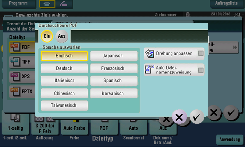 [EIN]/[AUS] | Wählen Sie [EIN], um eine durchsuchbare PDF-Datei zu erstellen. |