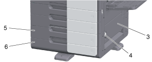 6 | Fach 4/Vorratsbehälter | Wird als Vorratsbehälter verwendet, wenn die Einzel-Papiereinzugseinheit installiert wird. Dieser Behälter fasst bis zu 500 Blatt Normalpapier, wenn die Doppel-Papiereinzugseinheit installiert ist. Ausführliche Informationen über das verfügbare Papier finden Sie [Papier] . |