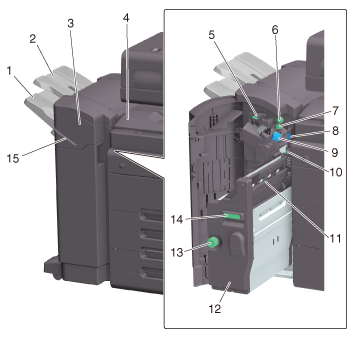 3 | Frontklappe | Öffnen Sie diese Klappe zum Beheben eines Papierstaus oder Heftklammerstaus oder zum Austauschen eines Heftklammermagazins. |