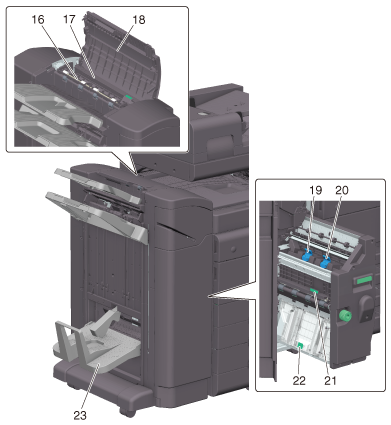 18 | Obere Abdeckung | Öffnen Sie diese Abdeckung, um Papier zu entfernen, das einen Papierstau im Finisher verursacht hat. |