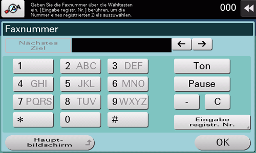 Wenn Sie auf [Faxnummer] tippen, wird der Eingabebildschirm für die Faxnummer angezeigt. Geben Sie die Zielinformationen manuell ein.