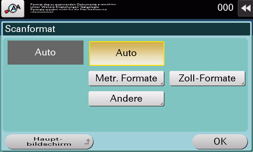 Wählen Sie diese Option aus, um eine Postkarte oder ein Original, das kein Zollformat oder metrisches Format hat, zu scannen. Wenn Sie auf [Andere] tippen, können Sie die einzelnen Standardformate auswählen.