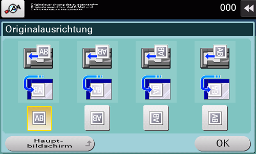 Tippen Sie auf [Scaneinstellungen] - [Originaleinstellungen] - [Orig.-ausrichtung], um die Originalausrichtung anzugeben.