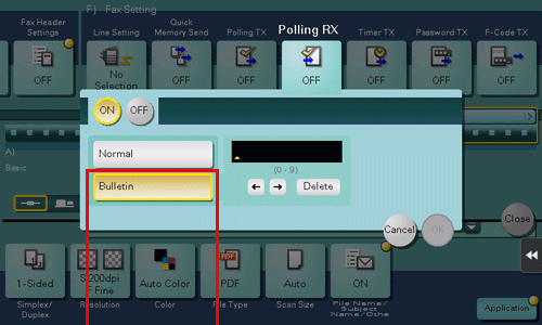 Tap [Bulletin], enter the number of the Bulletin Board User Box in the receiving machine, and tap [OK].
