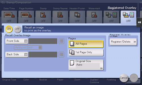 [Recall Overlay Image] | Specify which side of the paper to compose the overlay image, and select an overlay image to be composed. Check the density, composition method, preview, and other conditions of overlay image if necessary. If you set [Apply on Back], the image on the front side is composed on the back side of paper. |