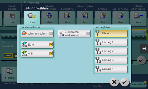 [Leitung auswählen] | Bei Verwendung mehrerer Telefonleitungen wählen Sie die zum Senden von Faxdokumenten verwendete Leitung aus. In der Regel wird [Leitung 1] verwendet. Wenn [Keine Auswahl] angegeben wird, wird eine beliebige freie Leitung für die Übertragung verwendet. |