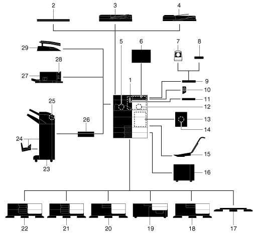 21 | Paper Feed Cabinet PC-216 | Allows you to load up to 500 sheets respectively in the top and bottom trays. This unit is referred to as Double Paper Feed Cabinet in the manual. |