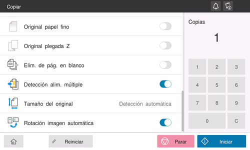 En el uso general, la máquina gira automáticamente la imagen original según la dirección del papel para realizar una copia. Al desactivar la opción [Rotación automática de la imagen] podrá hacer copias sin girar la imagen original. Esta función está disponible cuando se desea copiar solamente una parte del original.