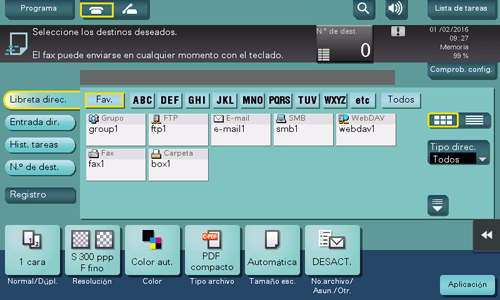 Si toca el icono de voz en la pantalla en el modo de escanear/enviar por fax del estilo clásico, la máquina lee en voz alta el procedimiento de funcionamiento cuando introduce directamente un número de fax. Además, cuando selecciona un destino en la libreta de direcciones o el historial, esta máquina lee en voz alta el procedimiento de funcionamiento. Esta opción sirve para evitar que un fax se envíe a un destino incorrecto.